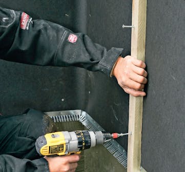 Säädä pyörösaha ikkunalaudan kulman mukaan ja sahaa poikittais-lista ikkunalaudan alustaksi. Naulaa lista aukkoon, niin saat ikkunalaudan pituisen alustan, johon liuskekivilevy kiinnitetään.