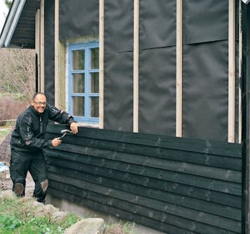 Ennen kuin julkisivuverhouksen vaaka-suoria lautoja aletaan naulata paikoil-leen, täytyy talon nurkkiin saada tuki niitä varten. Teimme nurkkalautojen tuen 50 × 50 mm:n kokoisista ThermoWood-listoista, jotka kiinnitimme nurkkiin nauloilla.