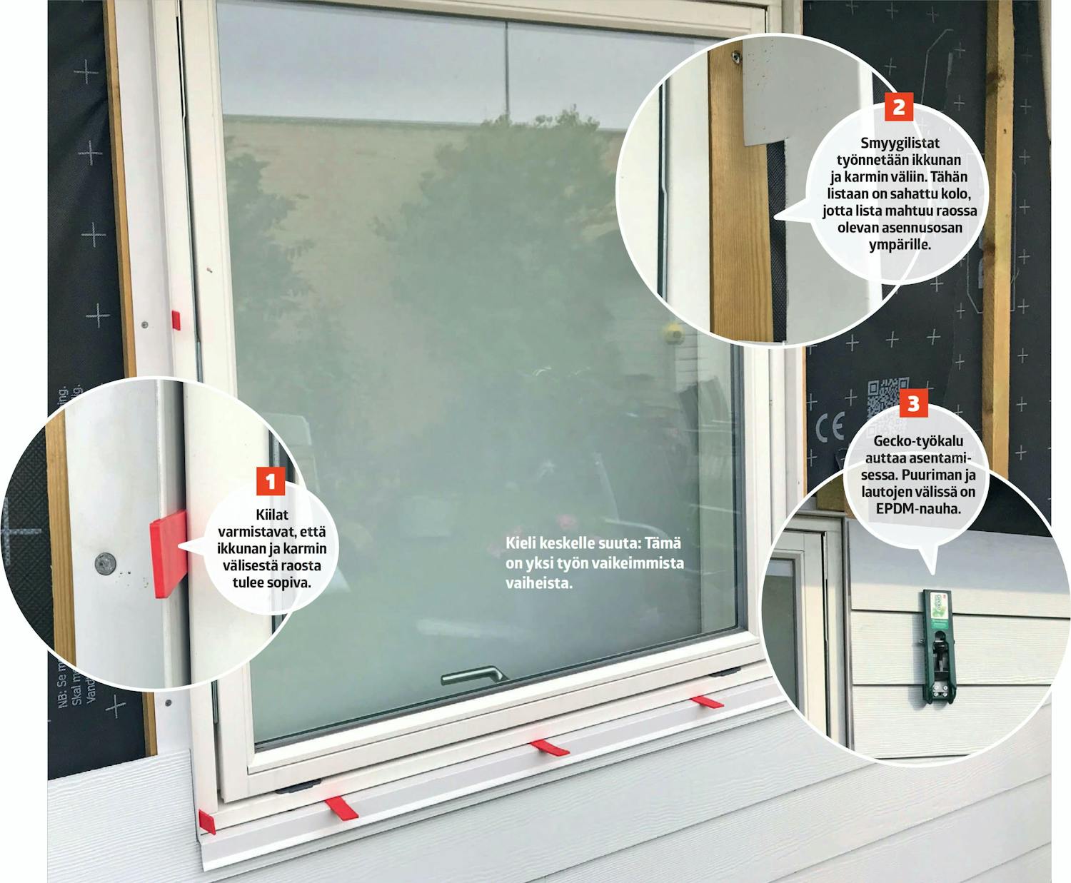 Kiinnitä rimanpätkät ikkunoiden ja ovien päälle. Asenna ikkunan päälle reunapelti, ENNEN kuin kiinnität riman ikkunan päälle.