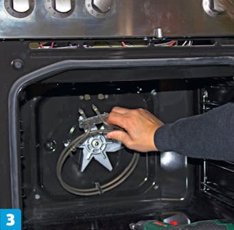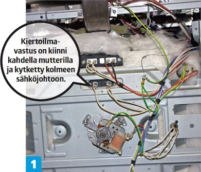 Irrota virtajohto ja vedä liesi ulos. Irrota kiertoilmavastus taustasta. Irrota aluksi taustalevy ja johdot ja irrota sitten mutterit.