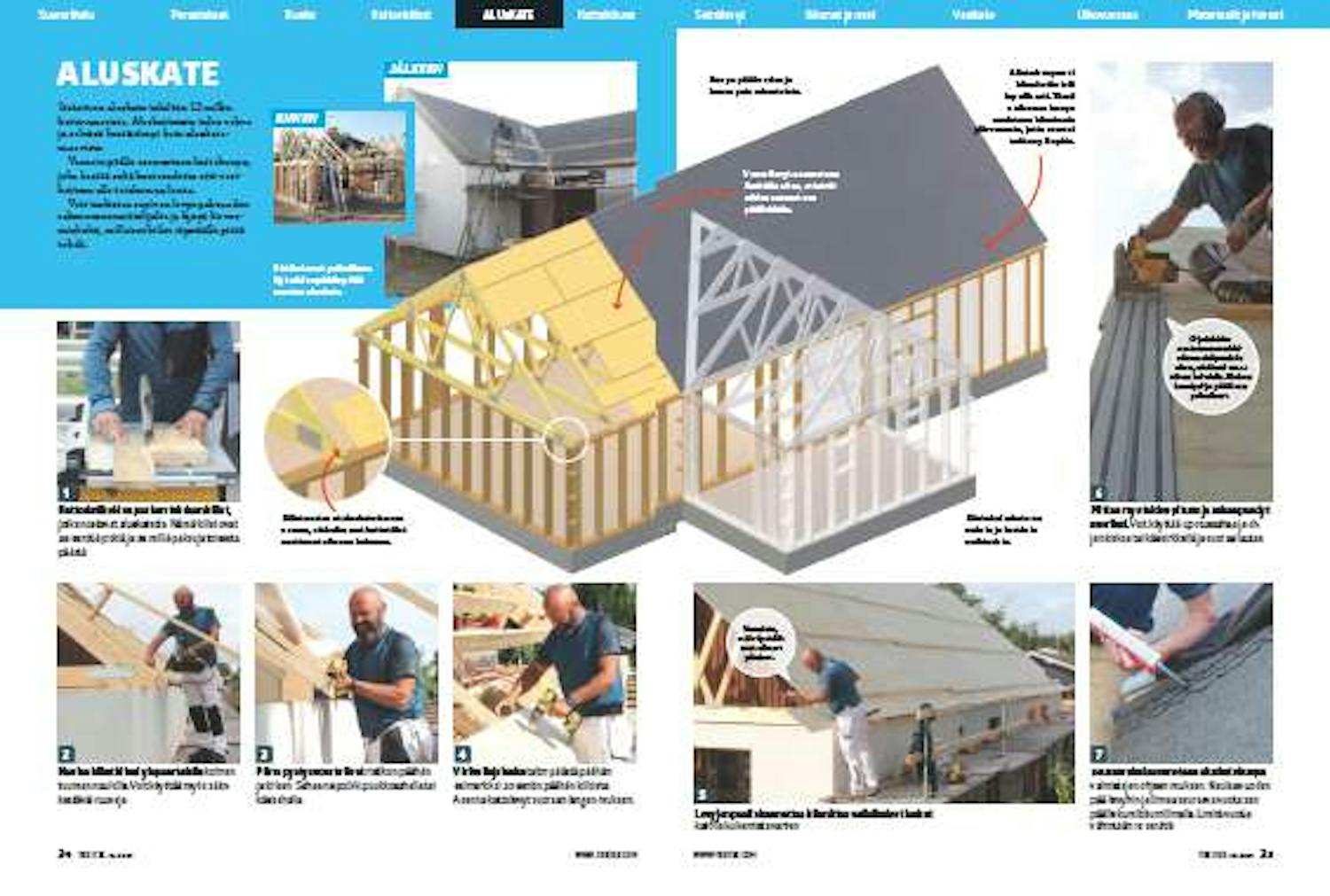 Lankut sahataan sopiviksi räystäältä ja harjalta. Lankkuihin naulataan kiilat kuten muillekin räystäille. Sen jälkeen aluskatele vyt ruuvataan kiinni lankkuihin 6x100 millin ulkoruuveilla.