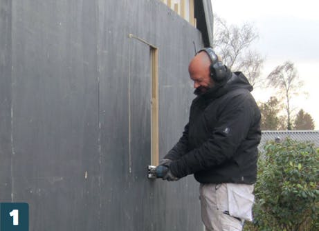 Sahaa aukot ikkunoille ja oville. Piirrä aukkojen reunaviivat ja poraa nurkkiin reiät. Aukoista tehdään 7,6 senttiä isommat ja leveämmät kuin ikkunoista, jotta reunoille jää tilaa smyygilaudoille.