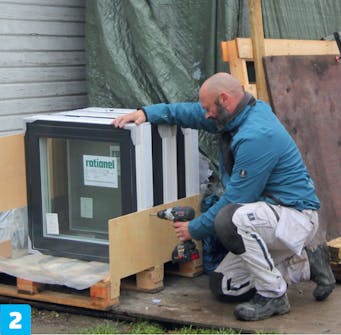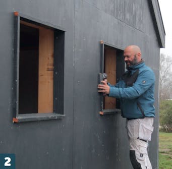 Seuraavaksi aukkoihin asennetaan ikkunat. Se on melko yksinkertaista: ikkunoiden pitää olla pysty- ja vaakasuorassa, ja niiden joka puolella pitää olla yhtä paljon tilaa. Tässä ikkunoiden ympärille jätetään noin 15 millin raot.