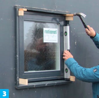 Aseta ikkuna-aukon alareunalle kolme kiilaa, ennen kuin nostat ikkunan paikalleen. Tässä käytetään muovi-kiiloja, joilla on helppo säätää ikkuna suoraan.