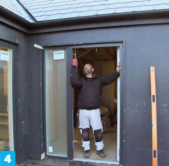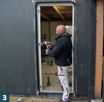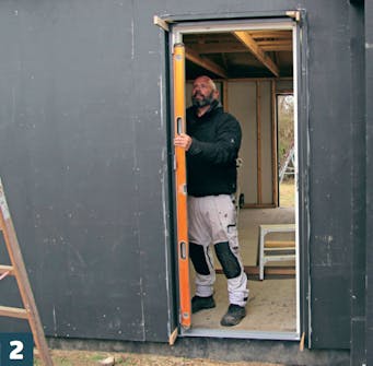 Aseta kynnys varovasti kapuloiden päälle ja työnnä karmi lyijykynämerkkien kohdalle. Kiilaa ovi kiinni ylhäältä ja alhaalta ja ruuvaa karmi kiinni saranapuolelta.