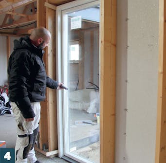 Työnnä mineraalivillaa karmin ja runko tolpan väliin. Eristeiden pitää täyttää rako kokonaan, mutta eristeitä ei saa painaa kasaan.