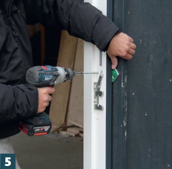 Poraa oven lukkopuolelle kuusi ruuvinreikää, jos niitä ei ole valmiiksi. Nosta sivuovi paikalleen. Nyt sivuovi ja karmi ruuvataan yhteen 5x50 millin ruuveilla.