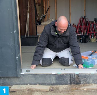 Smyygilauta on asennettu, ja kynnyksen voi tukea oikeaan korkoon. Alumiinikynnys on melko hutera, joten se tuetaan viidestä kohdasta. Kynnysen ja betonilattian väliin jätetään 12-15 millin rako.