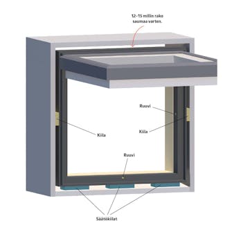Ikkunoiden pitää olla suorassa smyygilautoihin nähden, ja karmin joka puolella pitää olla samanlainen rako. Se on helppo varmistaa kiiloilla.