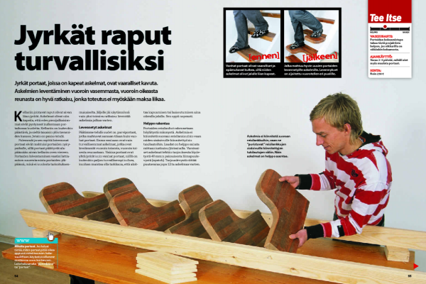 Portaiden reisilankut rakennetaan höylätystä männystä. Askelmia ei kiinnitetä suoraan reisilankkuihin vaan niiden sisäsivuille kiinnitettyihin tukilautoihin. Laudat on helppo sahata mittaan katkaisu/jiirisahalla. Varsinai-set askelmat tehtiin tarjouksesta löyde-tystä 40 mm:n paksuisesta liimapuule-vystä (nyatoh). Tarjouslevystä riittää puutavaraa jopa 12:ta askelmaa varten.
