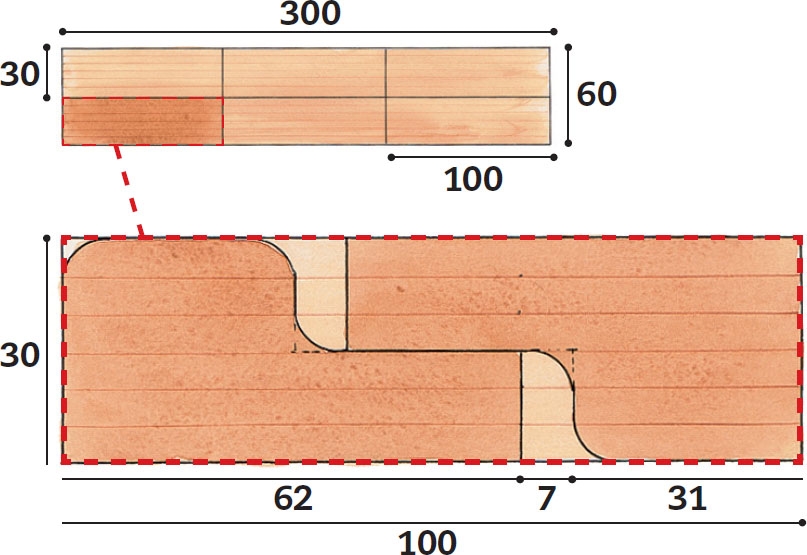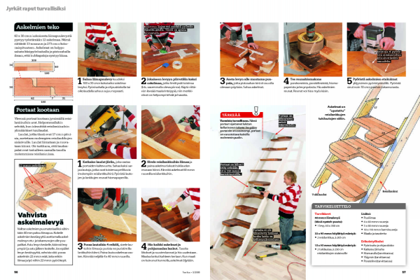 60 x 30 cm:n kokoisesta liimapuulevystä pystyy työstämään 12 askelmaa. Nämä riittävät 13 nousuun ja 273 cm:n koko-naispituuteen. Askelmat on helppo sahata käsipyörösahalla ja pistosahalla ilman, että hukkapaloja syntyy liikaa.