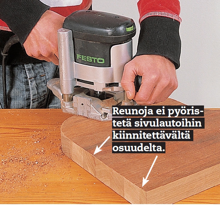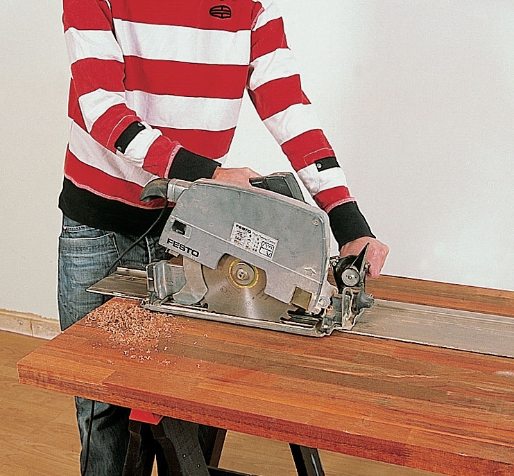 Sahaa liimapuulevy kuudeksi 100 x 30 cm:n kokoiseksi askelma-levyksi. Pyörösahalla ja ohjauskiskolla tai oikolaudalla sahaus sujuu nopeasti.