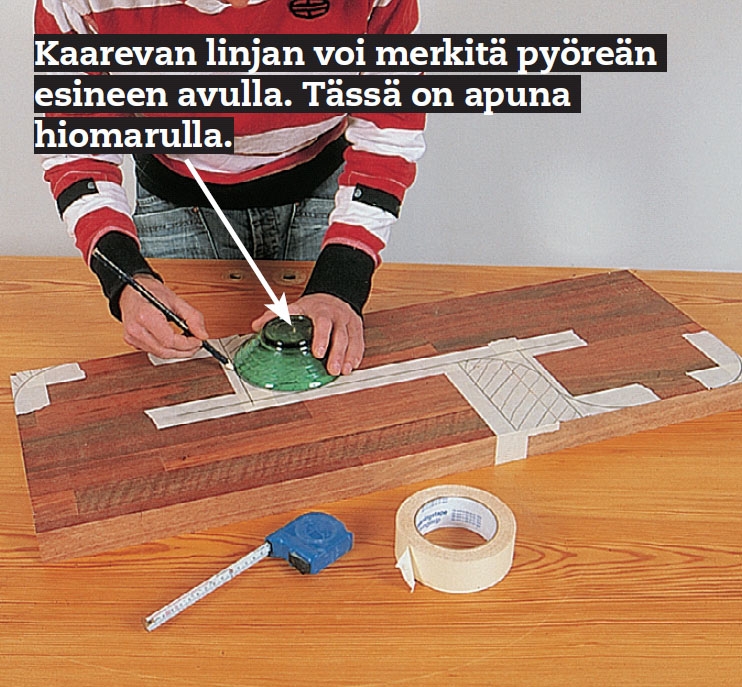 Jokaiseen levyyn piirretään kaksi askelmaa, jotka limittyvät toisiinsa (kts. vasemmalla oleva piirros). Käytä riittä-vän leveää maalarinteippiä, niin merkki-viivat on helpompi tehdä ja havaita.