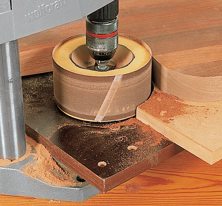 Tee reunahiomakone porakoneesta, poratelineestä, hioma-paperista ja levynpalasta. Hio askelmien reunat. Reunat voi hioa myös käsin.
