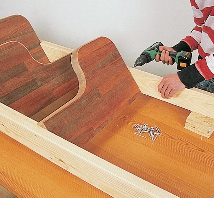 Laudat, jotka tässä ovat 17 cm:n pitui-sia, asetetaan molempien reisilankkujen sisäsivuille. Laudat liimataan ja ruuva-taan kiinni. Ole tarkkana, että laudan-palat ovat tarkalleen samalla tasolla molemmissa reisilankuissa.