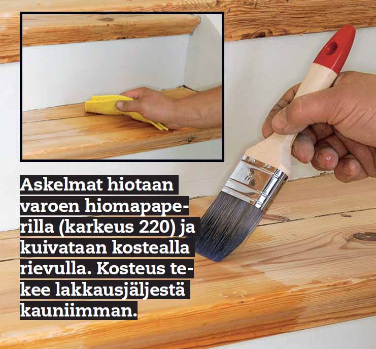 Askelmien rinnat ja reunapalkit maalataan varoen sotkemasta maalilla askelmia - ne voi suojata peiteteipillä. Tässä käytimme kulutuksenkestävää ja nopeasti kuivuvaa puolihimmeää alkydimaalia.
