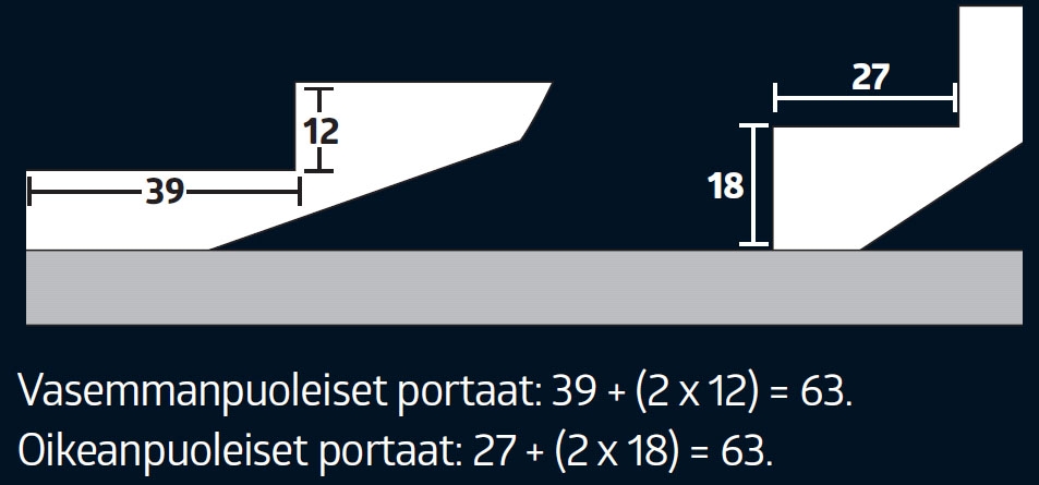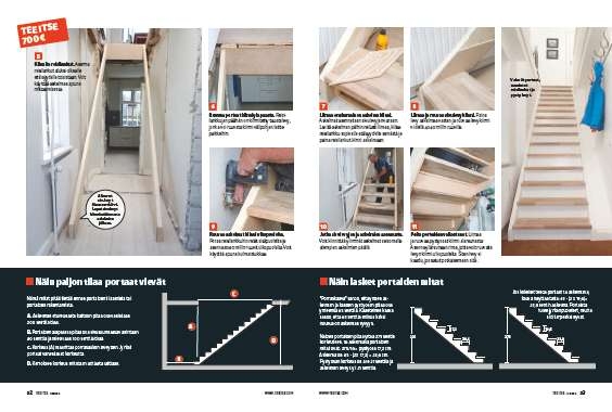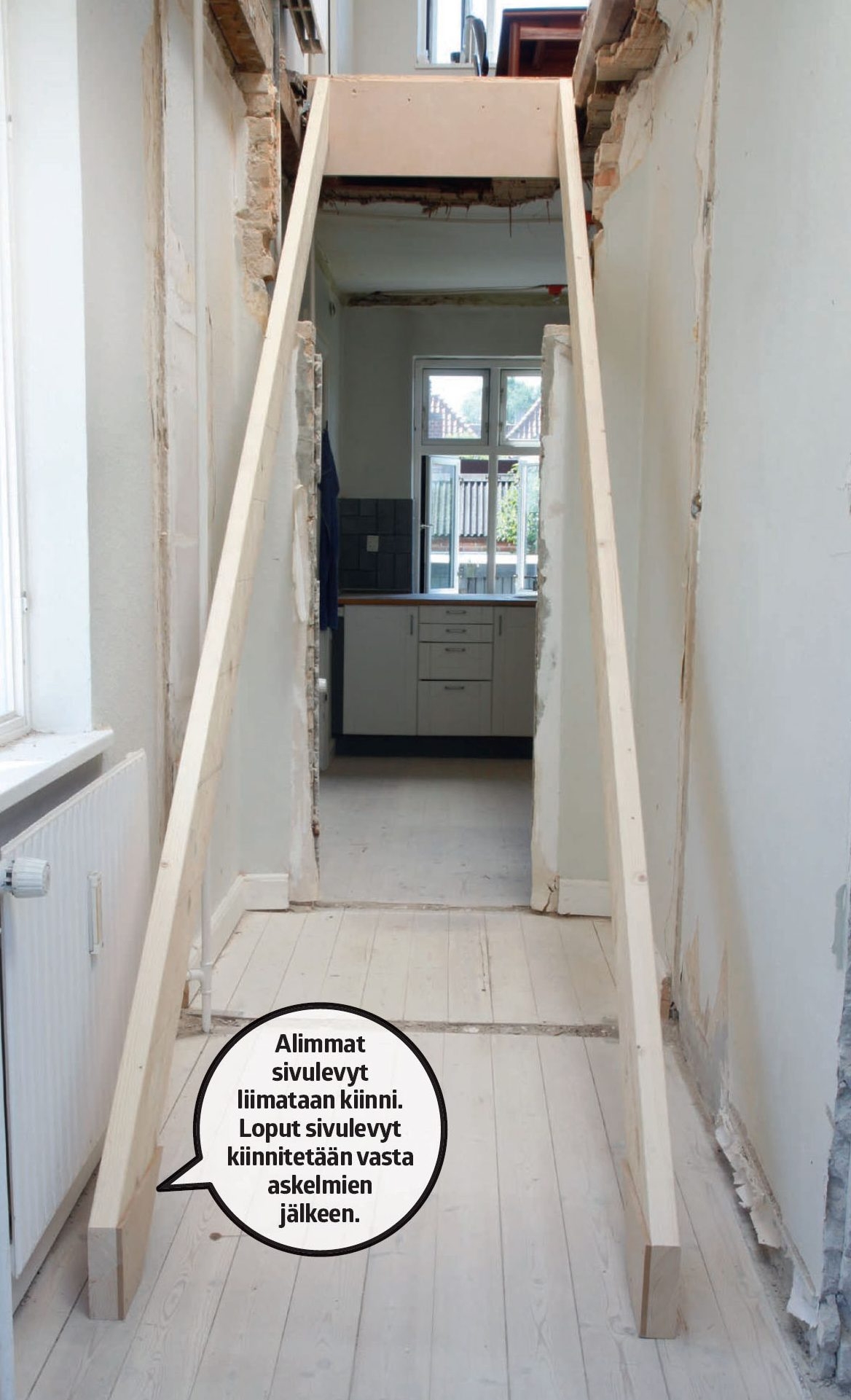 Ruuvaa portaat kiinni yläpäästä. Reisi lankkujen päähän on kiinnitetty taustalevy, jonka voi ruuvata kiinni välipohjan lattia palkkeihin.