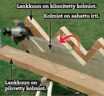 Sahaa kolmiot ensimmäisestä reisilankusta pisto- tai käsisahalla. Käännä kol-miot ja kiinnitä ne lankun yläpintaan pu-liimalla ja pitkällä ruuvilla, jolloin lankkujen vaakalinja pitenee. Ensimmäistä lankkua voidaan käyttää kaavana muille reisilankuille.