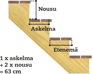 Portaiden perinteinen matemaattinen kaava perustuu 63 cm:n askelmapituu-teen tasamaalla. Kaava on: 1 x askelma + 2 x nousu = 63 cm.