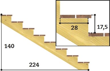 Kuten piirroksista näkyy (kts.ed.sivu), sahaamme reisilankuista vain puolet as-kelmaleveydestä, sen jälkeen käännäm-me sahatut kolmiot ja kiinnitämme ne lankkujen yläpintaan, jolloin askelmista saadaan täysileveät.