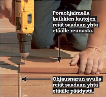 Ruuvien reiät esiporataan pora-ohjaimen avulla. Se on lauta, johon on jo kertaalleen mitattu ja merkitty kaksi reikää, joiden läpi reiät porataan kaikkiin lautoihin. Reikien sijaintia ohjataan narulla.