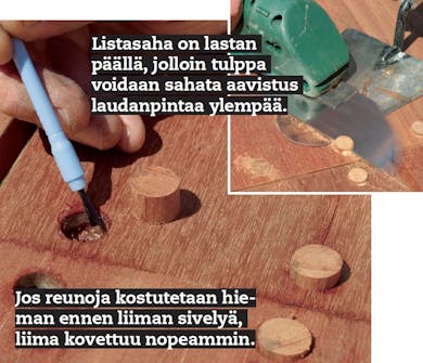Katamme hienojen kovapuulautojen ruuvinreiät puutulpilla. Osittain esteetti-sistä syistä, osittain käytännön syystä, sillä jokaisesta ruuvista jää pintaan pieni uppouma, johon vesi voi jäädä seiso-maan ja imeytyä puuhun.