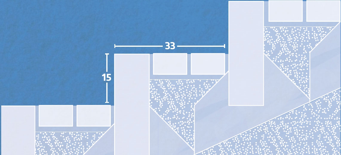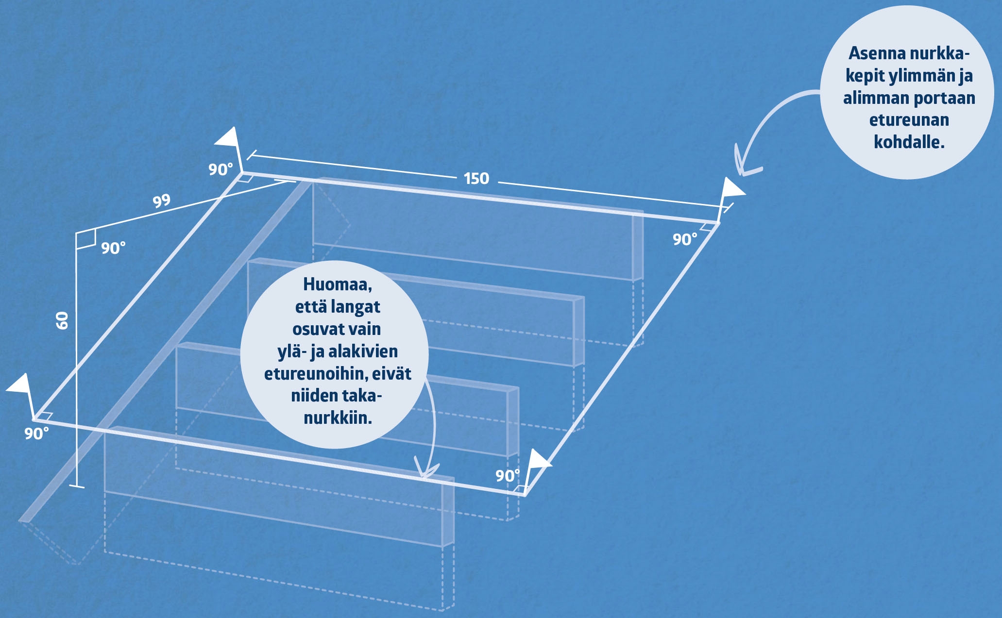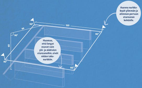 Merkitse seuraavaksi jokaisen portaan etureunan paikka. Näihin portaisiin tulee vain neljä askelmaa, joten niiden paikat on suhteellisen helppo mitata.