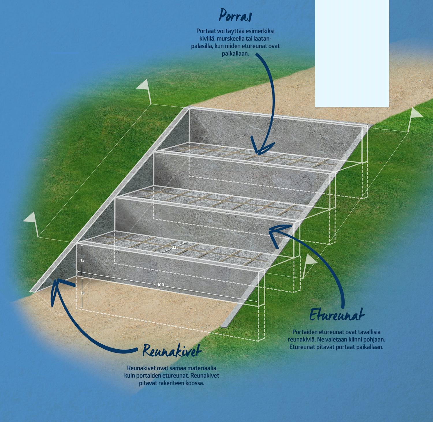 Päätä, mihin portaat tulevat. Mittaa tarkasti ja viritä linjalangat oikeisiin paikkoihin. Näihin portaisiin tulee neljä etureunaa eli kolme 33 senttiä syvää askelmaa. Portaiden yhteenlaskettu pituus on 99 senttiä ja korkeus 60 senttiä. Portaiden reunat vahvistetaan molemmilta puolilta kahdella reunakivellä.