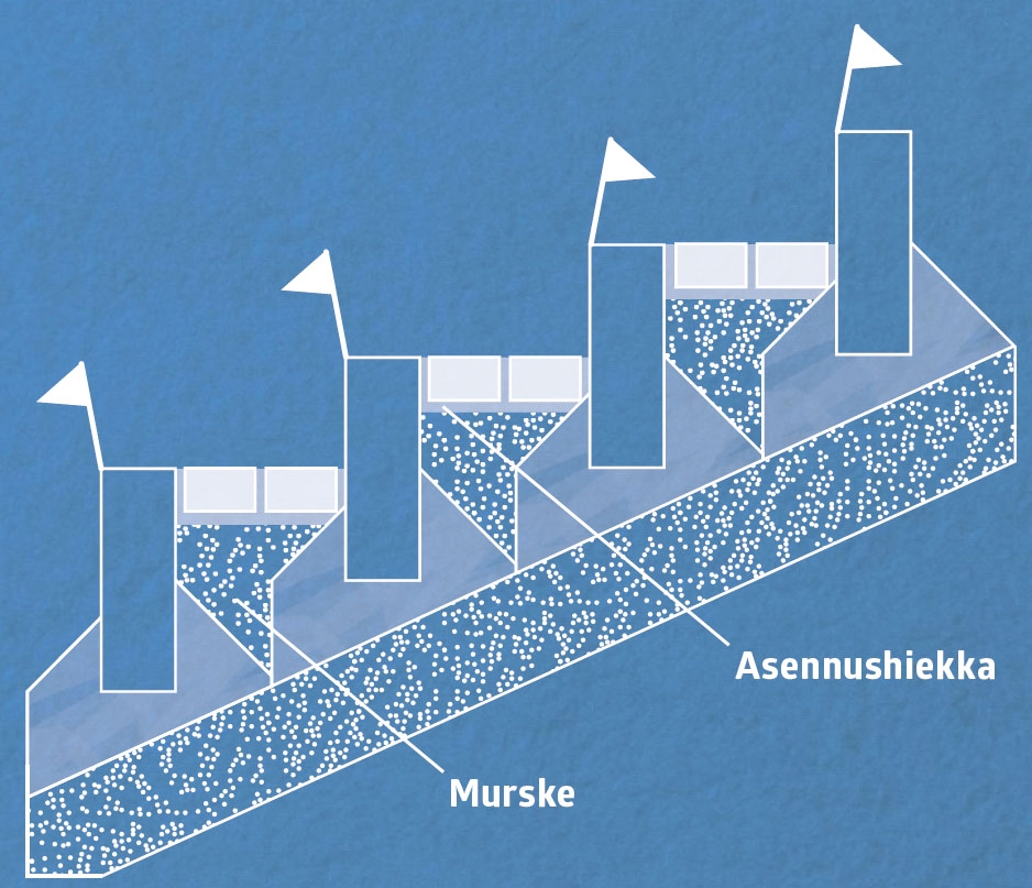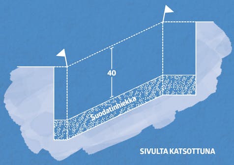 Lapioi kuoppaan suodatinhiekkaa ja tiivistä se 15 sentin kerrokseksi. Varmista, että hiekan pinnan ja linjalangan väliin jää 40 senttiä tilaa. Perustamistapa sopii routimattomalle maalle.