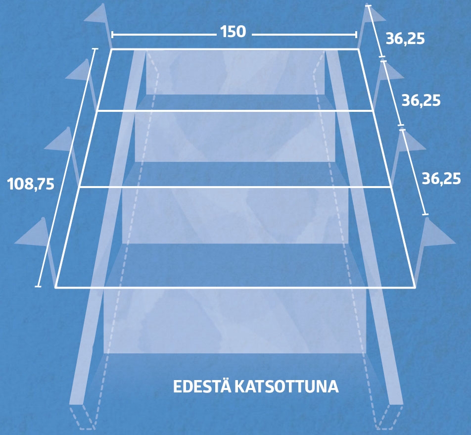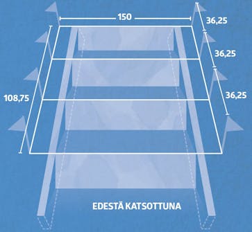 Alimman ja ylimmän portaan etureunan paikka on jo tiedossa, sillä ne sijaitsevat ylä- ja alalankojen kohdalla. Kaksi keskimmäistä porrasta pitää kohdistaa tasaisesti ylä- ja alaportaan väliin. Yhteismitta 108,75 senttiä jaetaan kolmella ja portaiden viereen pystytetään uudet kepit 36,25 sentin välein. Varmista, että langat ovat suorassa kulmassa ja vaakatasossa.