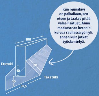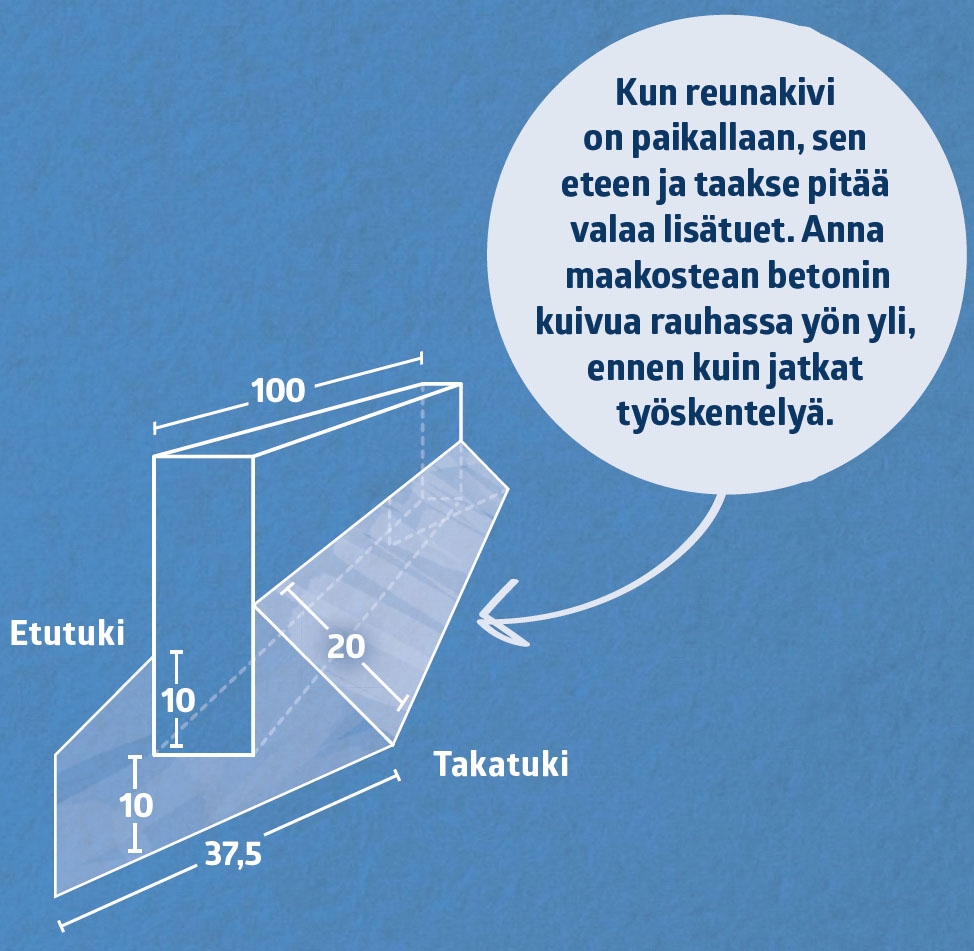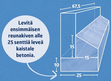 Pohja on valmis reunakivien ja askelmien etureunojen asentamiseen, kun etureunojen paikat ovat tiedossa. Asenna aluksi reunakivet ja lopuksi askelmien etureunat. Aloita sekoittamalla paljullinen maakosteaa betonia, johon kivet painetaan kiinni.