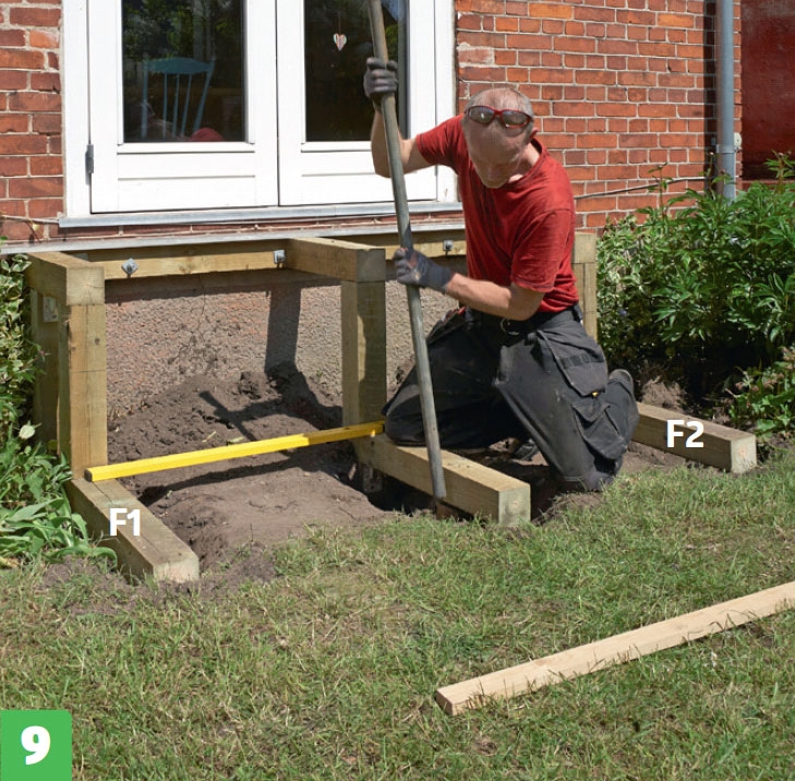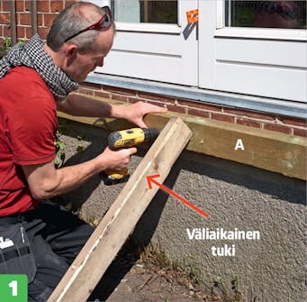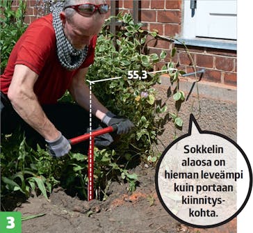 Väännä tolpalle (B1) kuoppa maakairalla sillä aikaa, kun kiinnitysmassa kuivuu. Reiän keskikohdan pitää olla viisi senttiä portaan reunan sisäpuolella ja 55,3 senttiä seinästä.