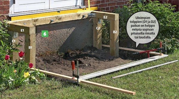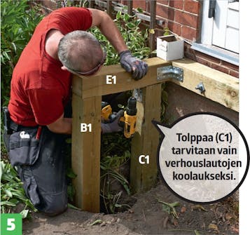 Kiinnitä tolppa (C1) kulmaraudoilla vaaka-puuhun (E1). Asenna sitä ennen tolppa (B1) omaan kuoppaansa ja ruuvaa vaakapuu (E1) siihen ylhäältä päin kahdella 5x180 millin ruuvilla.