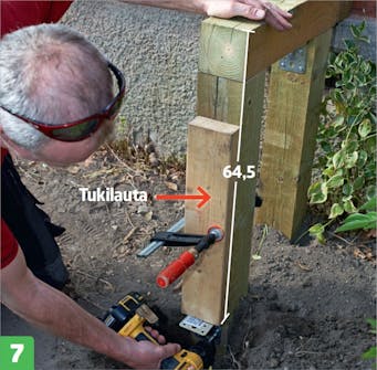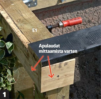 Ruuvaa kulmaraudat tolppien (B1 ja B2) kylkeen 64,5 senttiä yläreunasta. Voit käyttää apuna tukilautaa, jotta kulmarauta pysyy paikallaan.