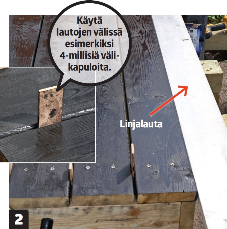 Ruuvaa yläportaan laudat kiinni molemmista päistä. Varmista uloimman laudan suoruus, ennen kuin kiinnität sen keskeltä. Voit käyttää apuna linjalautaa.
