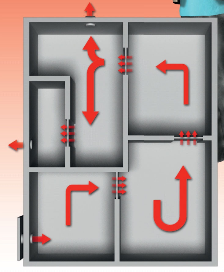 Kun aurinkokeräin puhaltaa kuivaa ja lämmintä ilmaa taloon, syntyy pieni yli paine. Ylipaine pyrkii työntämään kos tean ilman ulos kellarista, joten tarvi taan ilmanpoistokanava, joka samalla vetää vanhan ilman ulos.