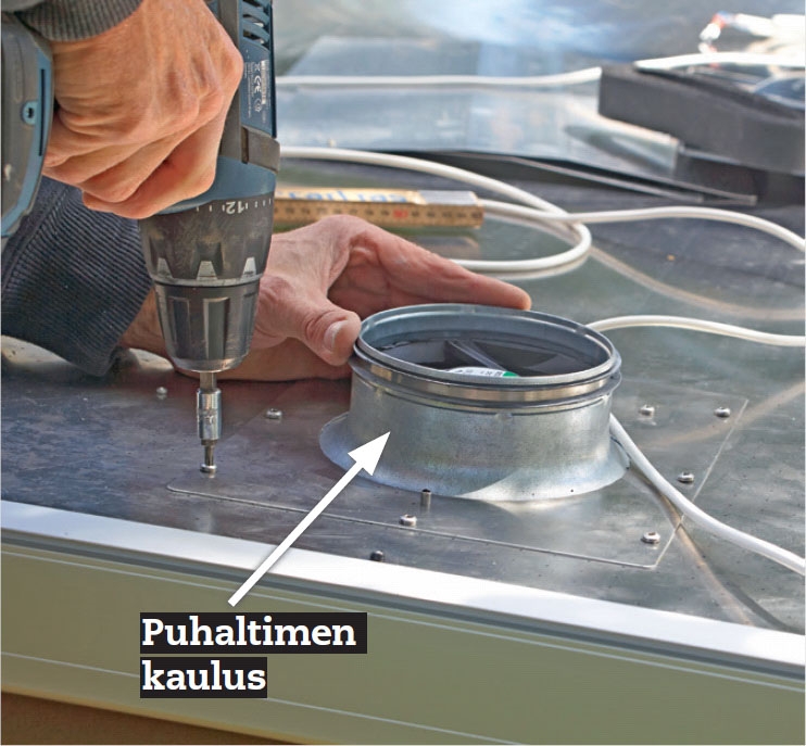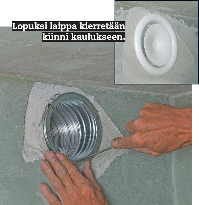 Kun seinään on porattu reikä, putki ja siihen asennettu puhallin työnnetään paikalleen. Johto vedetään tämän jälkeen kohtaan, johon säädin on tarkoitus sijoittaa.