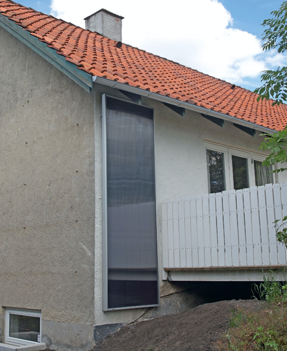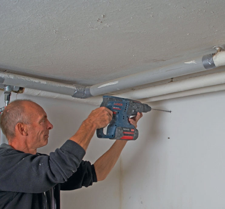 Talon seinän läpi on nyt porattu isot reiät, joten suurin haaste aurinko-ilmakeräimen asennuksessa on ohitet tu. Voit pyytää alan yrityksen poraamaan reiät, tai voit tehdä kuten kuvassa: vuokrata tarvittavat työkalut ja tehdä työn itse.