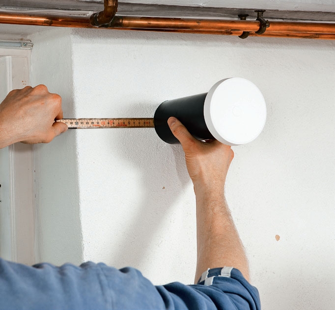 Merkitse mitta ulkoseinään. Mittaa jälleen ikkuna-aukon reunasta, mutta nyt putken keskikohtaan saakka. Nyt voit porata pitkällä ja kapealla poranterällä sisäpuolelta. Terän pitäisi osua lähelle ulkopuolelle tekemääsi merkkiä.