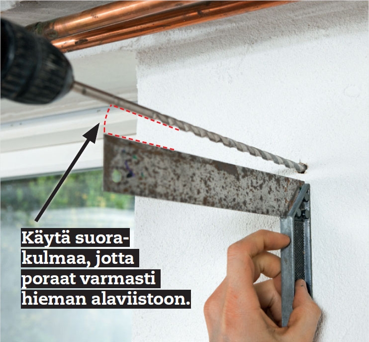 Poraa tarvittaessa pitkällä poran-terällä sisältä seinän läpi, jos olet epä-varma ulkomittauksistasi. Jos apuna ei ole ikkunaa, mittaaminen voi tuntua vaikealta.