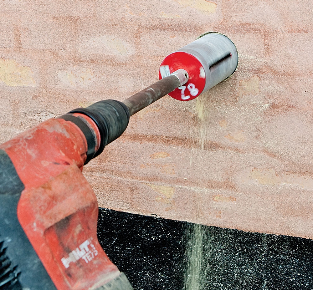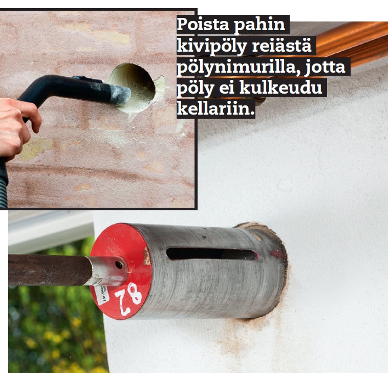 Poraa reikä ulkoa sisäänpäin. Pitele poraa niin, että poraat hieman yläviistoon. Näin sade- tai kondenssivesi ei valu kellariin. Pysäytä, kun terän ohjaus-kärki juuri ja juuri leikkaa seinän sisäpinnan.