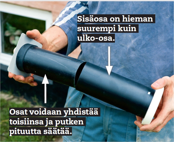 Asenna ulko-osa ulkoseinään. Työnnä putki reikään niin, että se yhdistyy toiseen putkeen.