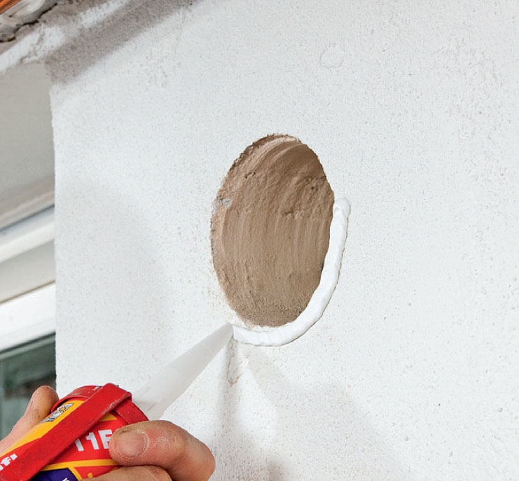 Pursota reiän ympärille sisä-seinässä vana asennusliimaa. Liima pitää venttiilin paikallaan ja tiiviinä, jolloin ilma ei karkaa aukon reunoista.