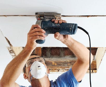 Ullakon puolella kulmien paikat merkitään reikien mukaan. Nyt uusi tukirakenne voidaan rakentaa ennen uuden aukon sahaamista. Näin välipohjaa ei tarvitse tukea työn aikana eikä siihen tule vahingossa vaurioita.