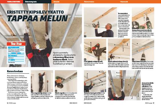 Kaksinkertainen kipsilevykatto on niin jäykkä, ettei se elä koolausten mukana. Lopuksi katon reunoille tehdään ääntä vaimentavat saumat.