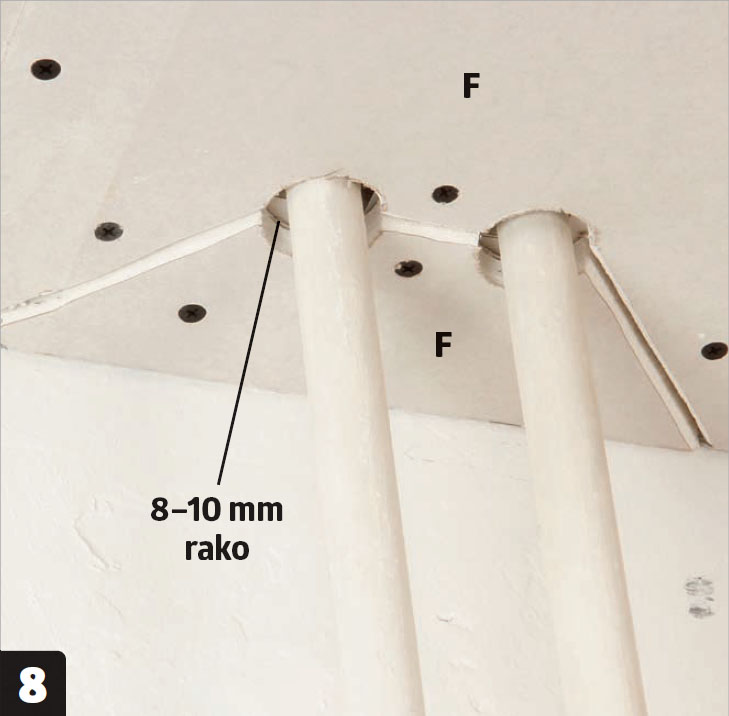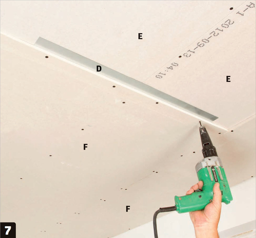 Kattoon asennetaan kaksi kerrosta 13 millin kipsilevyjä. Alempi kerros tehdään 90 senttiä leveistä levyistä (E). Toinen kerros tehdään kattolevyistä (F), joissa on neljä ohennettua reunaa.