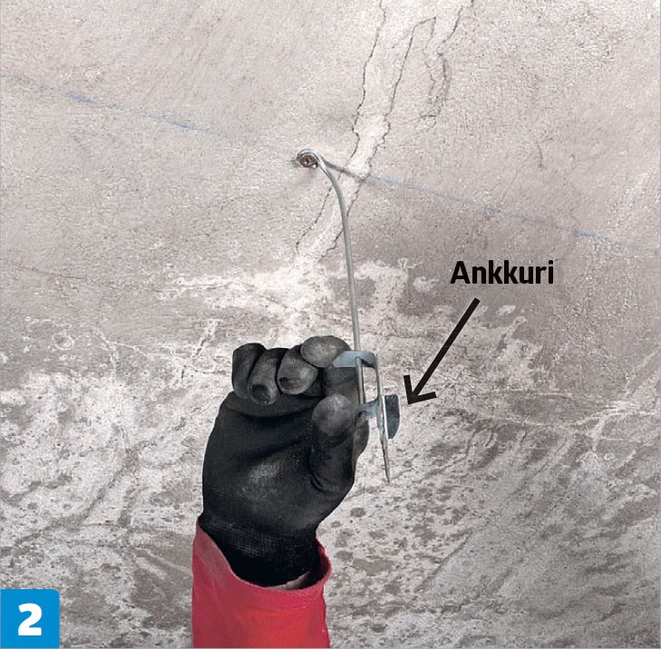 Kiinnitä kannakkeet kattoon. Ruuvaa ne kiinni 5x80 millin ruuveilla 50 sentin välein. Taivuta kiinnitettyä kannaketta alaspäin. Sen jälkeen toisessa päässä oleva ankkuri on valmis käyttöön.