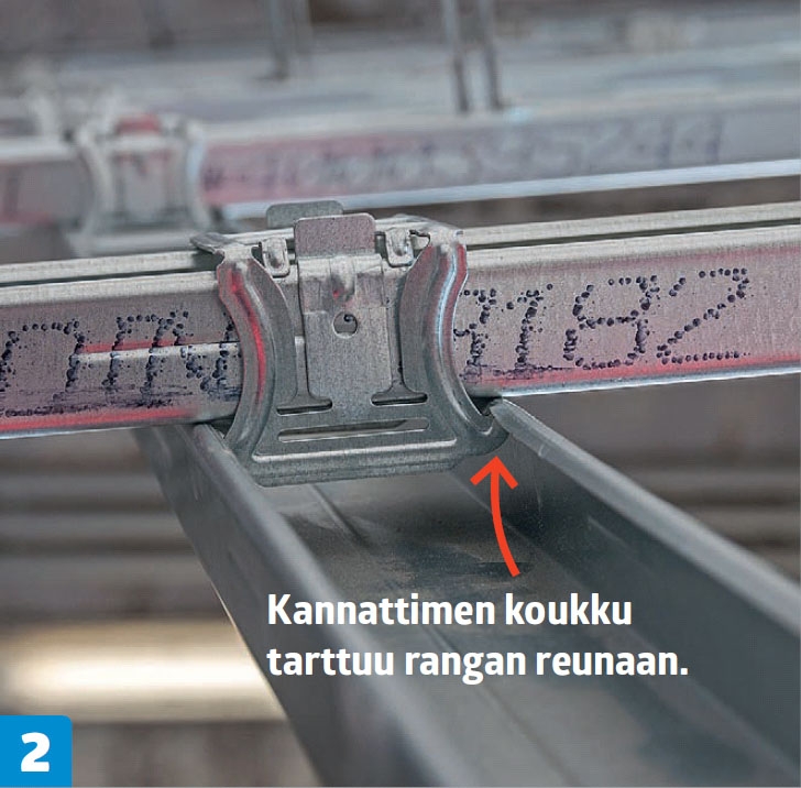 Pituussuuntaiset rangat asennetaan kannakkeisiin, jotka näyttävät paksulta rautalangalta. Kannakkeen toisessa päässä on ”silmä”, johon kiinnitetään kattoon asennettava ruuvi. Sen jälkeen kannake kääntyy alaspäin, ja sen toi sessa päässä on kiinnike, johon rangat kiinnitetään.