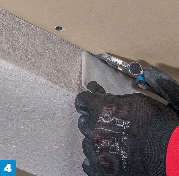 Leikkaa höyrynsulkumuovin päät poikki, kun levyt ovat paikoillaan. Voit käyttää tavallista mattoveistä.