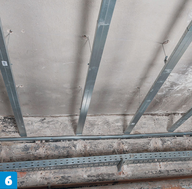 Kun teräsrunko on valmis, siihen asennetaan eristeet. Ne toimivat ääni eristeenä kellarin ja olohuoneen välillä.